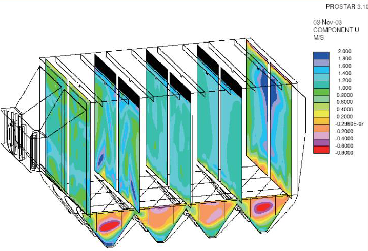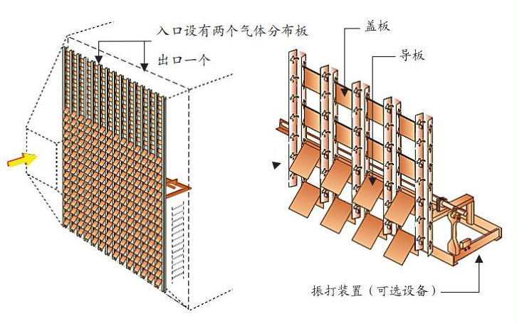 渦流,并在出風(fēng)口處可增加氣流分布板配合不同工況及出風(fēng)口的設(shè)置。防放電偏心懸吊極板及逐板振打技術(shù),避免了熱膨脹引起的變形同時又保證了振打力最大的傳遞。