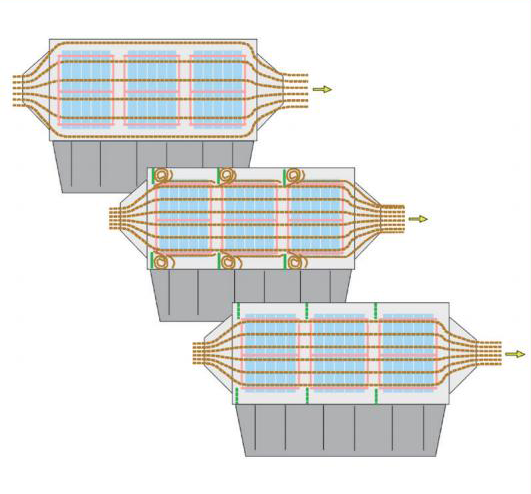 電除塵器的可調(diào)節(jié)氣流分布板及各電場齒形板的設(shè)計獨具優(yōu)勢,有效的防止了煙塵的逃逸和氣流渦流。ZT24 極板和 V15 極線已成熟應(yīng)用于水泥行業(yè)粉塵處理。在傳統(tǒng)的魯奇電除塵器基礎(chǔ)上改進了氣流均布系統(tǒng),在電場前段增加齒形板消除局部